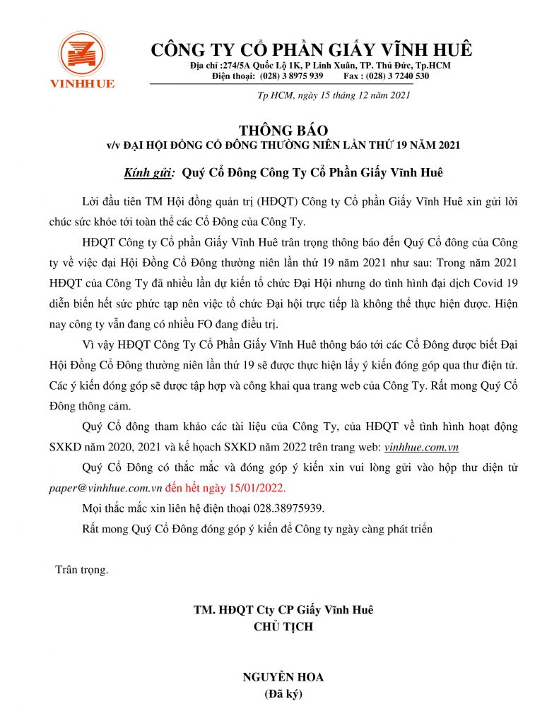 Tin Tức Đại hội cổ đông thường niên lần thứ 19 năm 2021 Posted on 22 Tháng Mười Hai, 202122 Tháng Mười Hai, 2021 by Admin Admin Báo cáo thường niên công ty cổ phần giấy Vĩnh Huê 2020 Báo cáo tài chính 2021